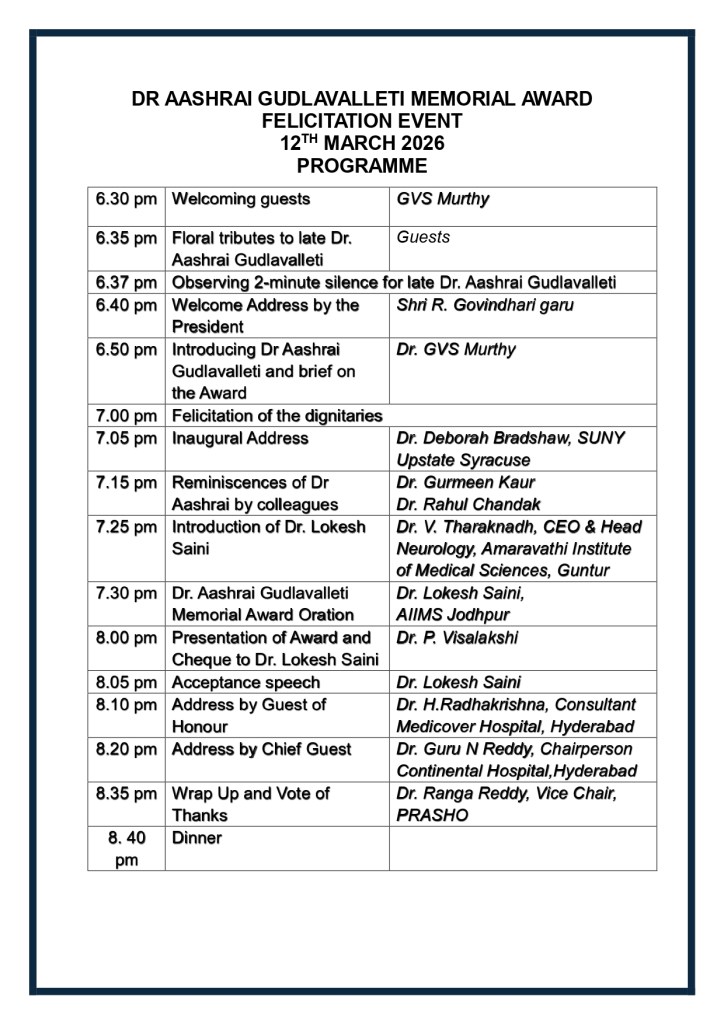 “We are honoured to establish this award in memory of Dr. Aashrai Gudlavalleti, whose passion for neurology and dedication to advancing medical knowledge will continue to inspire future generations,” said Dr. GVS Murthy, President and Dr P. Visalakshi, a Director at PRASHO Foundation. The objective of this award, is to encourage young researchers to pursue innovative approaches to understanding neurological disorders and improving patient care.