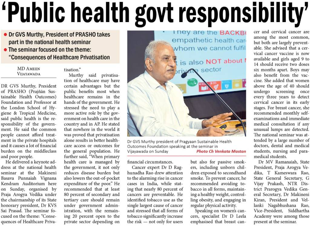 Dr. GVS Murthy, President of PRASHO (Pragyaan Sustainable Health Outcomes) Foundation, delivered a keynote address at the National Health Seminar organized by Praja Arogya Vedika in Vijayawada.